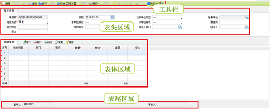 【工具栏区域】单据操作的功能按钮,按钮会根据单据状态亮显或置灰。各按钮的具体说明见功能按钮。