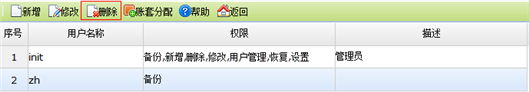 在账套用户管理页面,通过〖删除〗按钮可以删除账套用户,如下图所示: