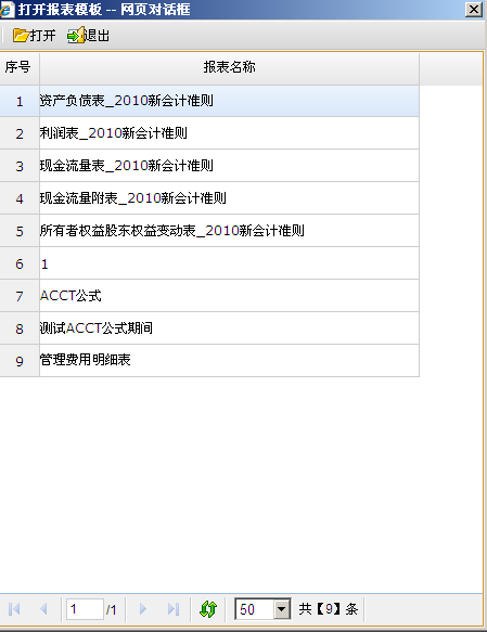 选择【文件】菜单,点击【打开】,进入“打开报表模板” 的页面,选中要打开的报表模板,点击打开,进入选择的模板页面;点击退出,退出报表模板页面。打开报表模板页面如下图所示:
