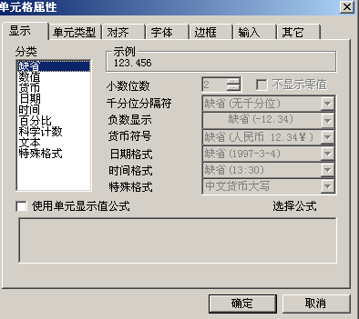- 【显示】页签,可以设置单元格属性为数值、文本还是日期格式等属性,默认为缺省格式。