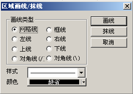 选中单元格区域,点击“格式”菜单下的“画线/抹线”,弹出“区域画线/抹线”页面。选择表格线的类型,点击“画线”,选中区域会根据表格线类型、样式、颜色设置表格线。点击“抹线”,系统会根据选中的表格线类型去掉已存在的表格线。点击“取消”,退出设置页面。“区域画线/抹线”页面如下图所示: