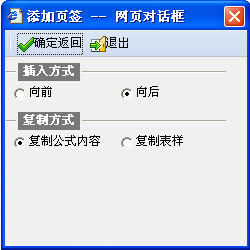 点击“表页/插入表页”菜单,或者在页签的位置单击右键,选择“插入表页”,系统弹出“添加页签”的页面。选择插入方式,点击“确定返回”则系统按照插入方式自动增加一个除了页签,和原页签内容一样的表页。但是插入的表页,页签名称不会复制到新表页,新表页的页签需要重新命名。添加页签的页面如下图所示: