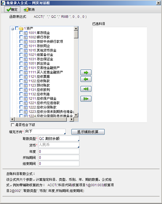 在“显示公式”状态下,选中单元格单击右键,选择【批量录入公式】,系统自动弹出批量录入公式的导航页面,批量录入公式主要是ACCT公式的批量录入,如下图所示: