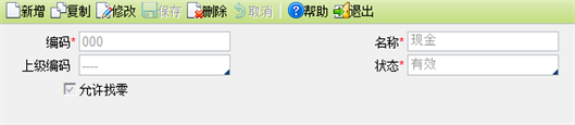 - 允许找零:仅在零售单和零售退货单使用,根据应收金额以及实际收款金额的差额计算找零金额,只有此属性设置为“是”的结算方式才允许找零。
