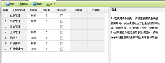 【主要功能】设置各子系统启用时间。包括启用年、启用期,被启用的子系统在“启用标志”处用“”表示。