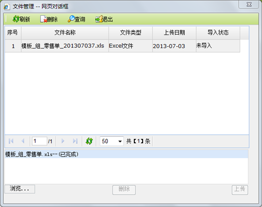,进入文件管理页面,点击【浏览】按钮,在本机中选择要上传的文件,点击【打开】按钮,文件显示在文件管理页面,点击【上传】按钮,将导入文件上传至系统,如下图所示:上传文件完成后点击【退出】按钮,退出文件管理页面。