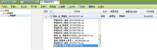 - 在单据导入页面,选择 “零售单”配置组,双击文件名称列下的空白格,选择所要导入的文件,点击〖导入〗按钮,即可执行单据的导入,并提示导入后的具体情况。如下图所示: