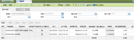 - 5月,鼎鑫公司业务扩展需要,在北京新建零售门店,将原来总仓的部分物品调拨到门店仓库,调拨好孩子奶粉1段盒装2箱,bb米粉5盒。录入调拨单: