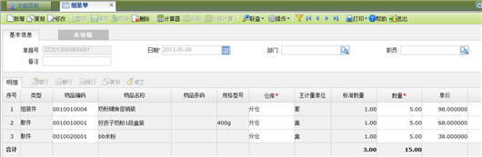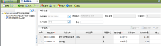 - 六一儿童节鼎鑫门店搞促销活动,将好孩子奶粉1段盒装,同bb米粉一起做捆绑销售,奶粉辅食促销装(1盒奶粉+1盒米粉)优惠价格为98元,门店库管对促销装做组合包装。对捆绑销售的物品维护物料清单,并录入组装单:
