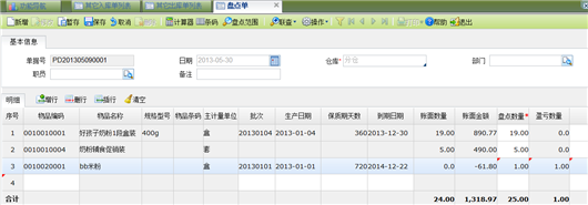 - 5月底鼎鑫门店对分仓库进行整仓盘点,发现库存中bb米粉同账面数量不一致,做盘盈处理。录入盘点单: