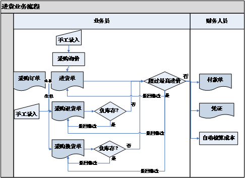 - 采购进货时,手工填制进货单或者参选采购订单,系统根据进货单供应商、物品、数量进行采购询价,取得进货价格。如果是采购现结可以在进货单上录入现结金额。