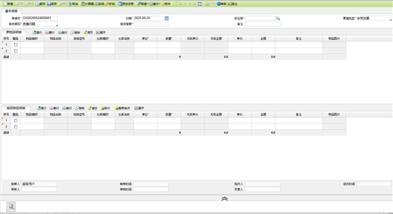 - 数量:手工录入,原物品明细行数量必须小于0,换回物品明细行数量必须大于0。