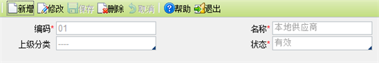 【第二步】通过〖新增〗、〖修改〗、〖删除〗、〖禁用〗按钮可以对供应商分类进行维护。在供应商分类页面,双击某一分类,则进入供应商分类编辑页面,如下图所示:
