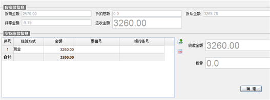 - 现结收款界面点【确定】按钮,收款完成后返回到单据界面。点右上角的×则返回到单据编辑状态,单据不保存。