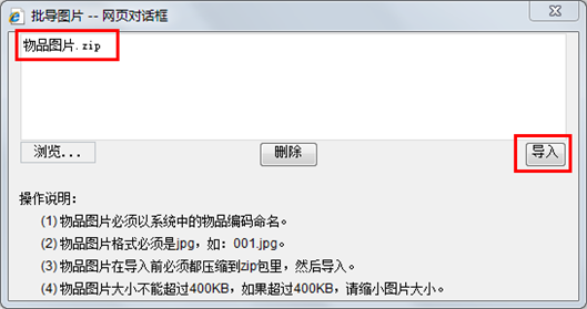 - 批导图片:批量导入多个物品的图片,按照操作说明整理物品图片后,点击〖浏览〗按钮选择图片压缩包,之后点〖导入〗按钮上传图片。如下图所示: