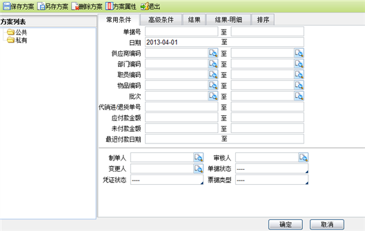 - 输入查询条件或选择已保存的查询方案,点击【确定】按钮,系统按条件过滤,并回到列表页面显示查询结果。