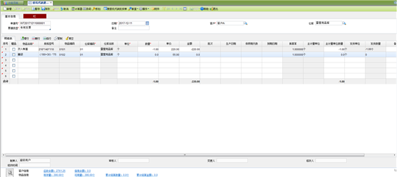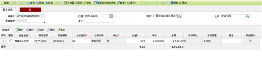- 修改相关数据后,点击【保存】按钮,完成退货单的填制。