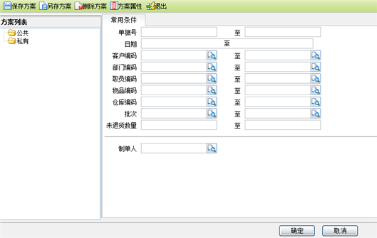 - 在“委托代销退货单”页面,点击【原委托代销发货单】按钮,系统显示委托代销发货单选择查询条件界面。将表头已录入客户、部门、职员带入到查询条件相应数据项中(起始值和终止值中都带入),如下图所示: