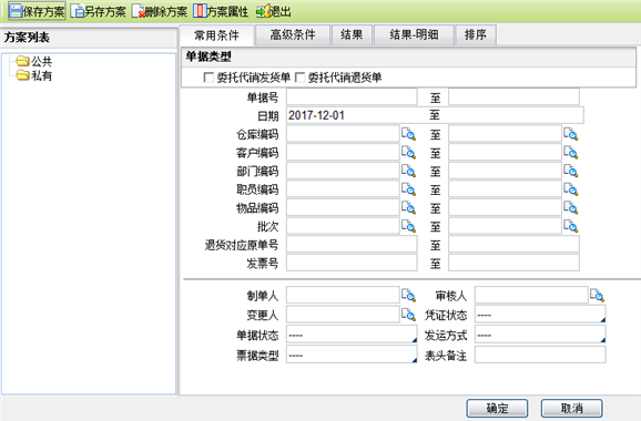 - 输入查询条件或选择已保存的查询方案,点击【确定】按钮,系统按条件过滤,并回到列表页面显示查询结果。