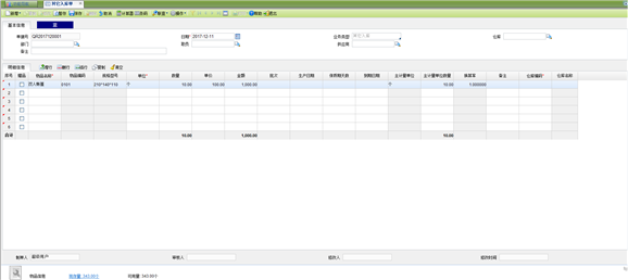业务类型:手工填写的其它入库单业务类型=“其它入库”。由库存调拨、库存盘点、组装、拆卸业务生成的其它入库单业务类型分别为“调拨入库”、“盘盈入库”、“组装入库”、“拆卸入库”。不可修改。