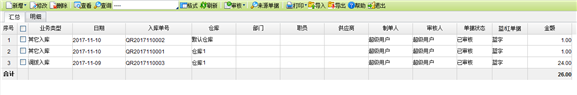 - 审核:对其它入库单进行审核、反审核以及审核所有页、反审核所有页。