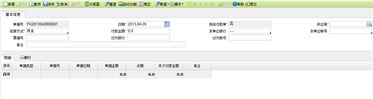 - 点击“购销存/往来/付款单”菜单项,进入付款单填制页面,如下图所示: