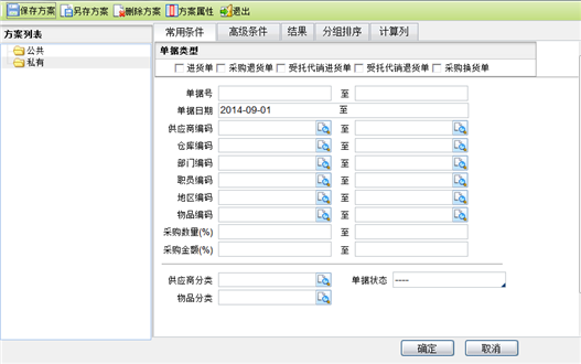 - 点击“购销存/进货查询/采购结构分析”菜单项,进入采购结构分析表查询条件设置页面。