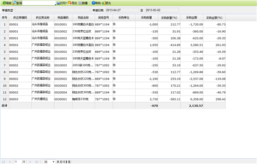 - 输入查询条件或选择已保存的查询方案,点击【确定】按钮,进入采购结构分析显示页面,如下图所示: