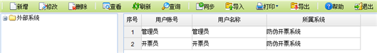 【主要功能】对可以从企业管理软件登录的外部系统用户信息进行维护,此功能只是在企业管理软件中保存一份外部系统用户档案,并对档案提供增加、查询、删除、修改等功能,这些操作并不会直接修改外部系统内的用户信息。目前功能支持的外部系统包括:防伪开票系统、网上认证系统。