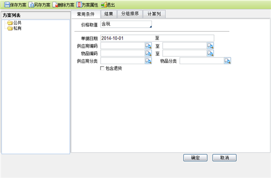 - 点击“购销存/进货查询/供应商供货价格分析”菜单项,进入供应商供货价格分析查询条件设置页面,如下图所示: