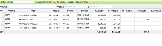 - 折扣总额: 销货单、销售换货单、销售退货单单据明细表折扣之和,委托代销结算单折扣总额取手续费金额。