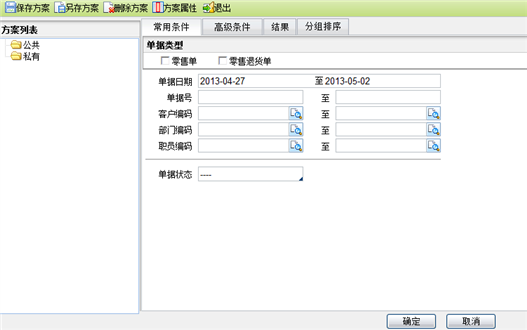 - 点击“购销存/销货查询/零售收款统计表”菜单项,进入零售收款统计表查询条件设置页面,如下图所示:
