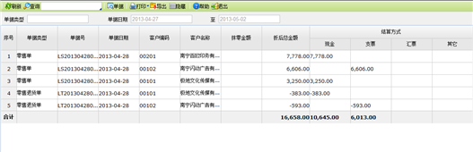 - 输入查询条件或选择已保存的查询方案,点击【确定】按钮,进入零售收款统计表查询结果页面,如下图所示: