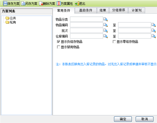 - 点击“购销存/库存查询/物品结存价格表”菜单项,系统弹出物品结存价格表查询条件设置页面,如下图所示: