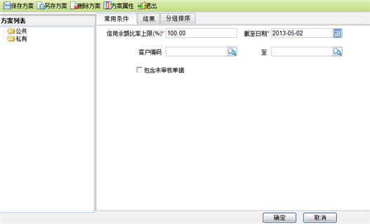 - 点击“购销存/往来查询/信用额度预警”菜单项,进入信用额度预警查询条件设置页面,如下图所示: