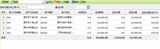 - 输入查询条件后,点击【确定】按钮,进入信用额度预警显示页面,如下图所示: