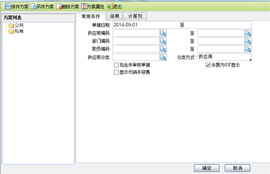 - 点击“购销存/往来查询/应付款明细表”菜单项,进入应付款明细表查询条件设置页面,如下图所示: