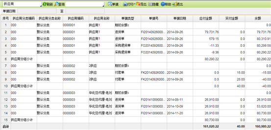 【主要功能】按供应商、供应商分类等查询一定期间内发生的应付及付款的明细情况。