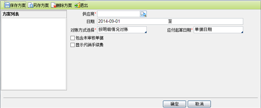 对账方式选择:按明细情况对账、按付款情况对账。付款结算方式如果为按供应商结算,系统自动选择对账方式为按明细情况对账,且对账方式不可改。只有参数付款结算方式选择按单据结算才能选择对账方式为按付款情况对账: