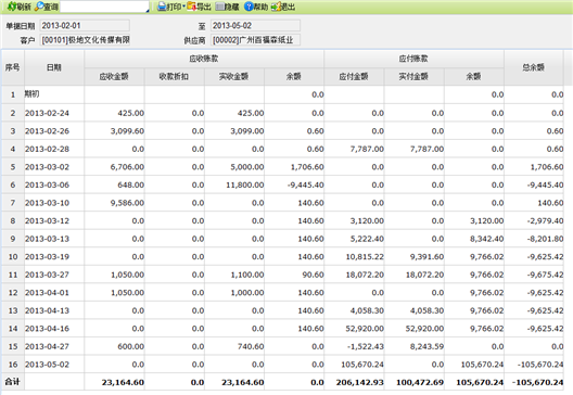 【主要功能】用于展现一定期间内按天汇总的某一客户应收、收款及余额情况与某一供应商应付、付款及余额情况,了解收付余额相抵后的剩余的应收余额,尤其适用于同一往来对象既是客户又是供应商的情况。