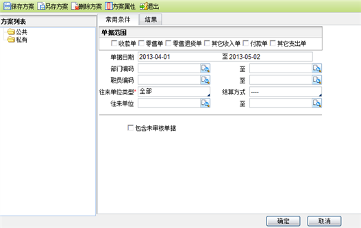 - 单据类型:含期初余额、收款单、零售单、零售退货单、其它收入单、付款单、其它支出单。