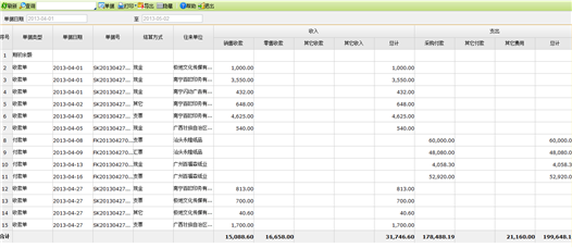 - 往来单位:显示收付款单、其它收支单、零售单对应的客户名称或供应商名称、往来单位。
