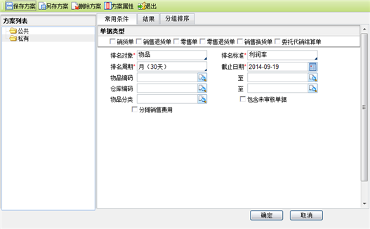 排名标准:在查询条件输入页面,下拉有利润率、利润额、单品毛利可选择。从而对利润额或单品毛利或利润率进行排序。