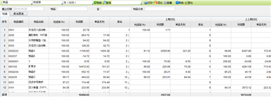 【主要功能】反映一段时期内物品或物品分类的利润率、利润额或单品毛利排名,并提供上期、上上期对比分析。