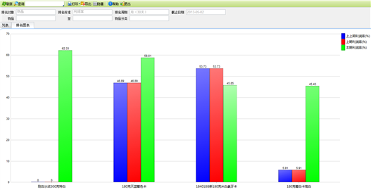 截止日期:在查询条件输入页面,默认为系统登陆当天,对截止日期之前的数据,按照排名周期计算本期数据后,根据排名周期进行对比分析。如:截止日期2012-07-27,排名周期选择一月,则将2012-07-27之前一个月的数据计算后进行排名,并提供在此之前两个月的对比分析。