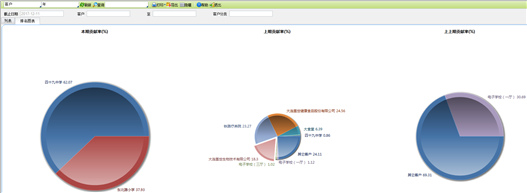 图表部分提供对比饼图:显示前10名以及其它客户总和,按客户或客户分类构成,按本期贡献率(%)排名、上期贡献率(%)排名、上上期贡献率(%)排名对比。