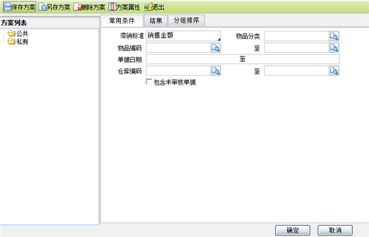- 点击“购销存/经营分析/物品滞销分析”菜单项,进入物品滞销分析条件设置页面,如下图所示: