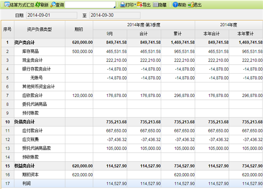 - 库存商品:统计库存商品科目的期初库存、进货、销货、委托、受托、库存所涉单据的成本合计