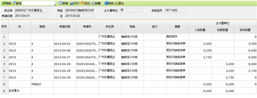 - 结存数量:期初 = 上期结存数量;其它行 = 上一行结存数量+本行入库数量-本行结算数量。