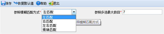 【第二步】在参照模糊匹配方式下拉框中,选择匹配方式,包括:左匹配、右匹配、左右匹配、精确匹配四种方式。设置参照型输入框联想输入时,备选内容的匹配筛选方式: